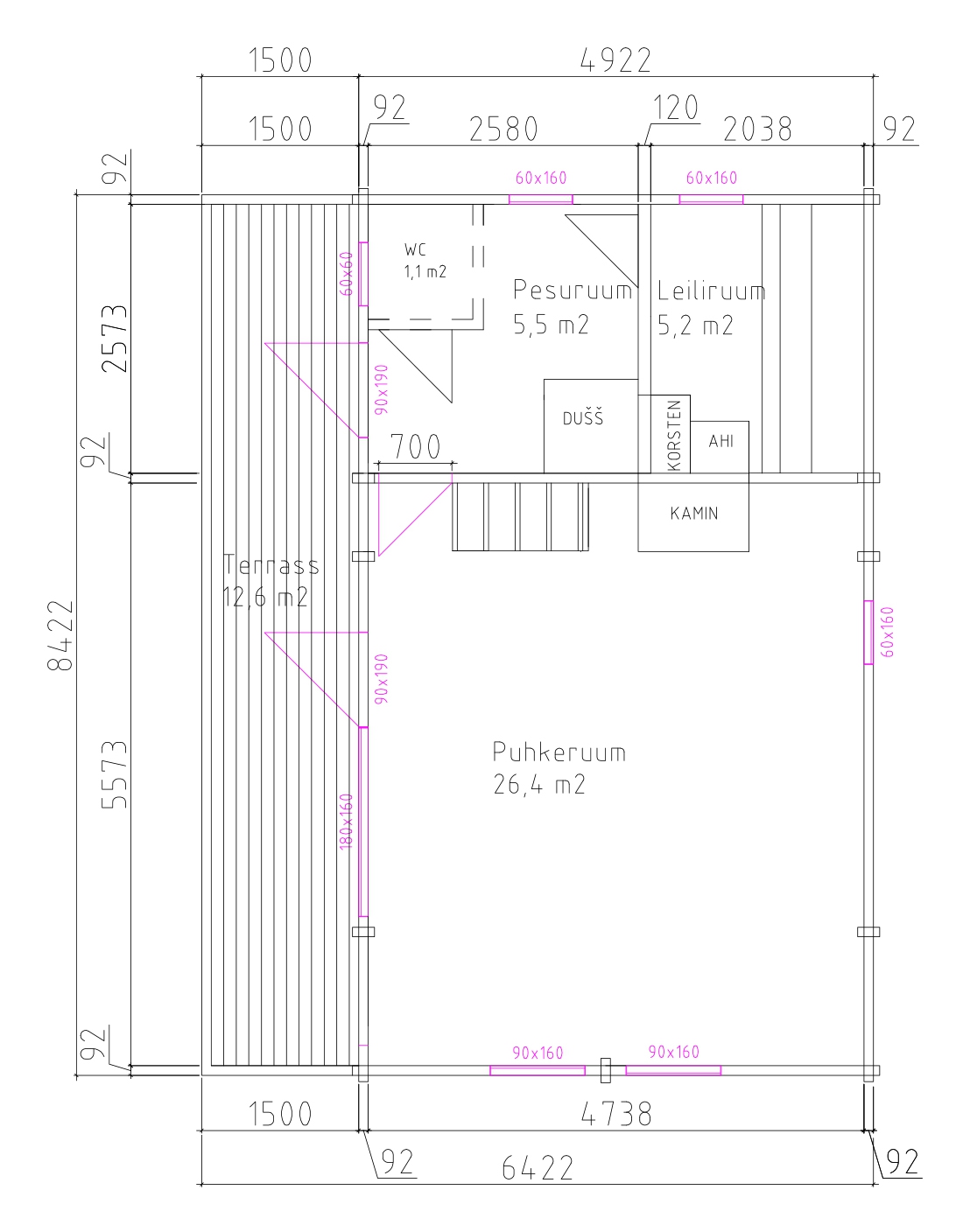 Sauna building “Salo” is a luxurious building with comfortable sauna rooms and a bright spacious recreation room with walls made of 90 mm squared logs. The house features a steam room, washroom and a recreation room. There’s a sleeping terrace under the gable roof above the steam room and the washroom. There’s a spacious terrace in front of the house to the extent of the full length of the house.