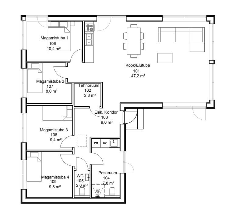 Majas on 4 magamistuba. Soovi korral saab kahe toa vahelise seina ära jätta ja nii ruumi pindala suurendada.